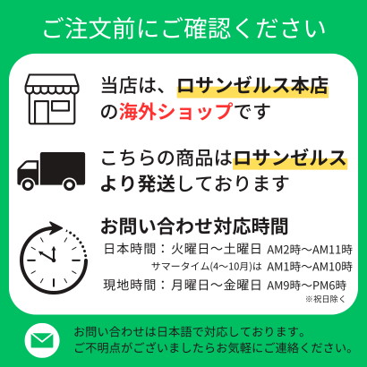 - お届け予定日は天候やフライト、通関の混雑状況よって遅延することもございますので予めご了承くださいませ。