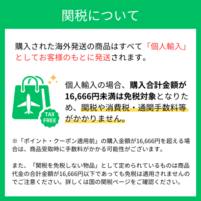 ・個人輸入される商品は、すべてご注文者自身の「個人使用・個人消費」が前提となりますので、ご注文された商品を第三者へ譲渡・転売することは法律で禁止されております。