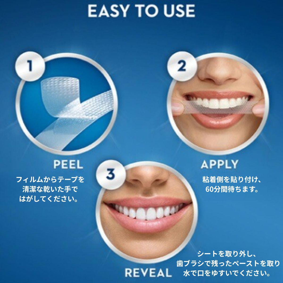 ・3D Whitestrips:1日1回・約60分間を目安に、20日間継続してご使用ください。